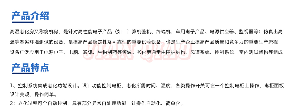 產(chǎn)品型號:JQHTA-12(非標(biāo)定制) 品牌:劍 喬 用途:高溫老化房又稱燒機房,是針對高性能電子產(chǎn)品(如:計算機整機、終端機、車用電子產(chǎn)品、電源供應(yīng)器、監(jiān)視器等)仿真出高溫等惡劣環(huán)境測試的設(shè)備,是提高產(chǎn)品穩(wěn)定性及可靠性的咨詢熱線:13829135130