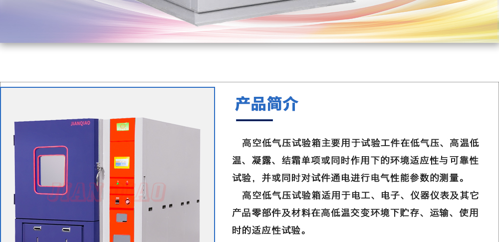 產(chǎn)品型號(hào):JQTA-504 品牌:劍 喬 用途:高低溫低氣壓試驗(yàn)箱主要用于試驗(yàn)工件在低氣壓、高溫低溫單項(xiàng)或同時(shí)作用下的環(huán)境適應(yīng)性與可靠性試驗(yàn),并或同時(shí)對(duì)試件通電進(jìn)行電氣性能參數(shù)的測(cè)量。咨詢熱線:13829135130