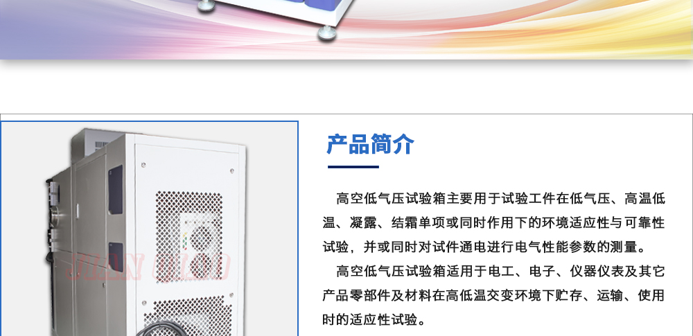 產(chǎn)品型號:JQTA-225 品牌:劍 喬 用途:高空低氣壓試驗箱主要用于試驗工件在低氣壓、高溫低溫、凝露、結霜單項或同時作用下的環(huán)境適應性與可靠性試驗,并或同時對試件通電進行電氣性能參數(shù)的測量。高空低氣壓試驗箱咨詢熱線:13829135130