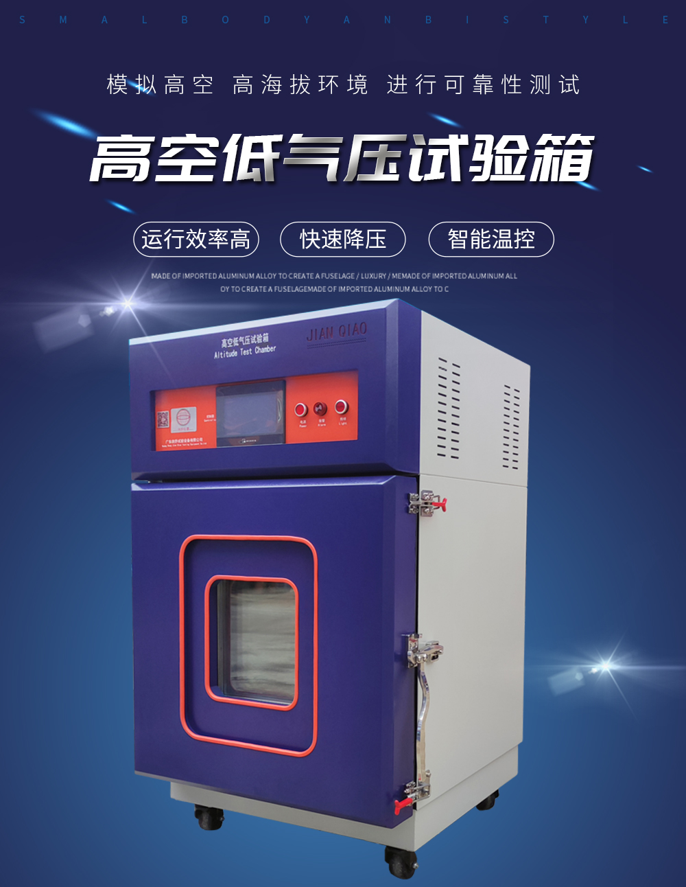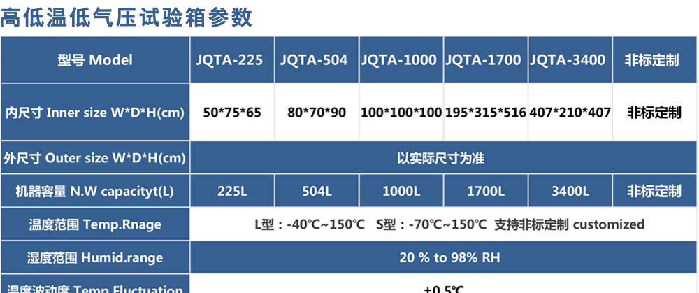 產(chǎn)品型號:JQTA-225 品牌:劍 喬 用途:高空低氣壓試驗(yàn)箱可以模擬高海拔、高空、(高原地區(qū))氣候進(jìn)行貯存運(yùn)用、運(yùn)輸可靠性試驗(yàn),并可同時對試件通電進(jìn)行電氣性能參數(shù)的測試設(shè)備。適用于國防工業(yè),航天工業(yè)自動化零組件,汽車咨詢熱線:13829135130