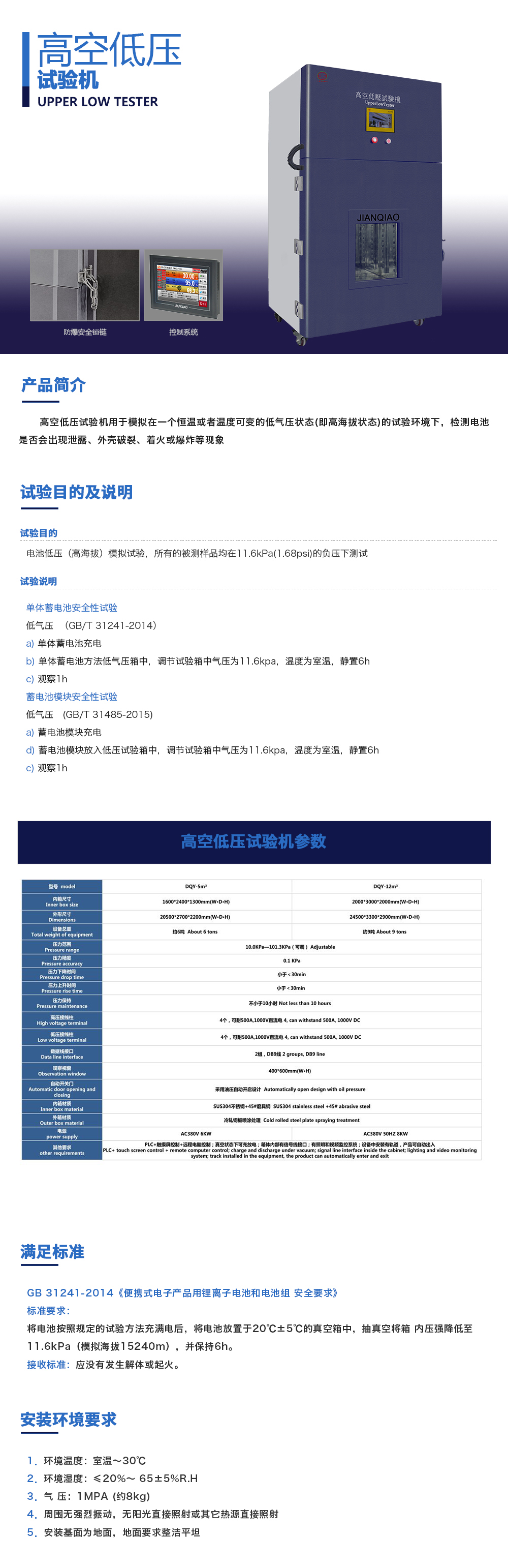 產(chǎn)品型號:JQ-8104(可定制) 品牌:劍 喬 用途:高空低壓試驗(yàn)機(jī)用于模擬在一個恒溫或者溫度可變的低氣壓狀態(tài)(即高海拔狀態(tài))的試驗(yàn)環(huán)境下,檢測電池是否會出現(xiàn)泄露、外殼破裂、著火或爆炸等現(xiàn)象。咨詢熱線:13829135130