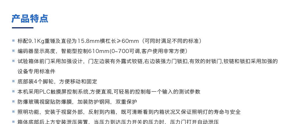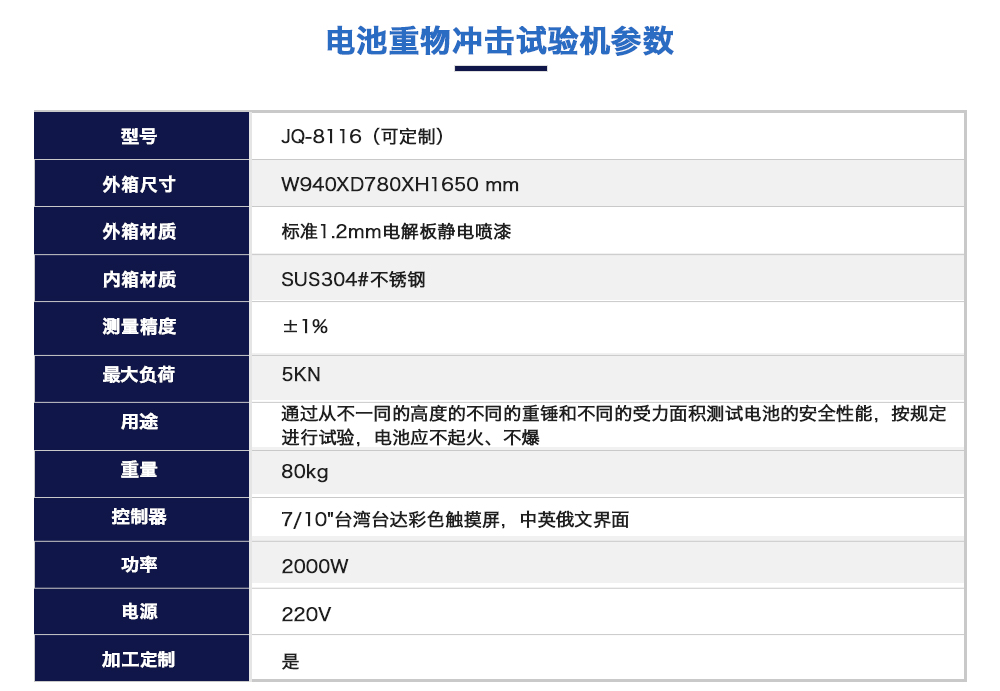 產(chǎn)品型號(hào):JQ-8116(定制款) 品牌:劍 喬 用途:電池重物沖擊試驗(yàn)機(jī)是模擬通過從不一同的高度的不同的重錘和不同的受力面積測試電池的安全性能,按規(guī)定進(jìn)行試驗(yàn),電池應(yīng)不起火、不爆炸。也是各電池廠家及研究所必不可少的檢咨詢熱線:13829135130