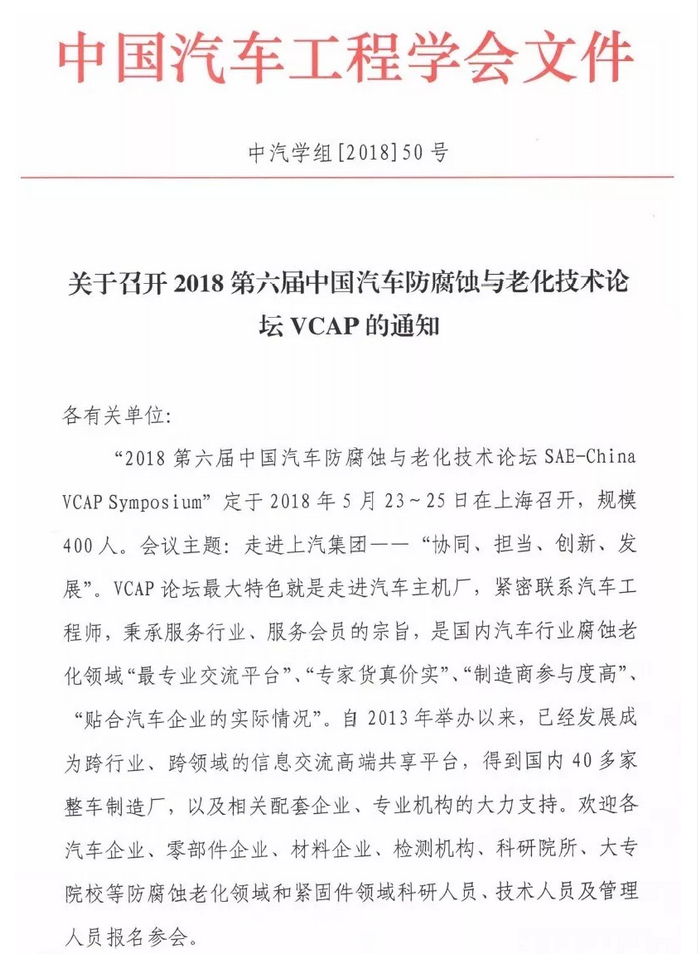 “2018第六屆中國(guó)汽車防腐蝕與老化技術(shù)論壇SAE-China VCAP Symposium”定于2018年5月23~25日在上海召開,規(guī)模400人。