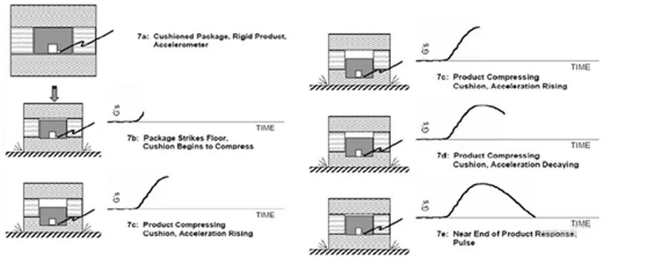 我們把產(chǎn)品受到?jīng)_擊一瞬間的整個(gè)過(guò)程分解開(kāi)來(lái),產(chǎn)品受到?jīng)_擊的過(guò)程大致如下圖,通過(guò)下面的圖片我們可以清晰的感受到產(chǎn)品受到撞擊或者跌落的一瞬間產(chǎn)品被壓縮,再把應(yīng)力釋放的整個(gè)過(guò)程: