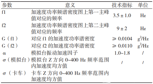 模擬運(yùn)輸臺(tái)的設(shè)計(jì)參數(shù)主要依據(jù)《QJ/T 815.2-94產(chǎn)品公路運(yùn)輸加速模擬試驗(yàn)方法》[3]設(shè)定。該標(biāo)準(zhǔn)中規(guī)定了模擬運(yùn)輸臺(tái)的關(guān)鍵技術(shù)指標(biāo),見(jiàn)表1。